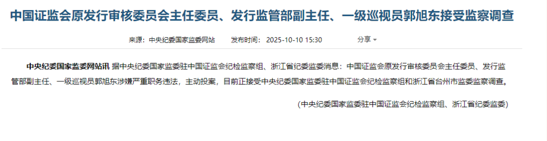按天十倍配资平台 中国证监会原发行审核委员会主任委员、发行监管部副主任、一级巡视员郭旭东接受监察调查 按天十倍配资平台 来源:互盈配资 网站:牛配资 日期:2025-10-10 17:57:19 查看:106