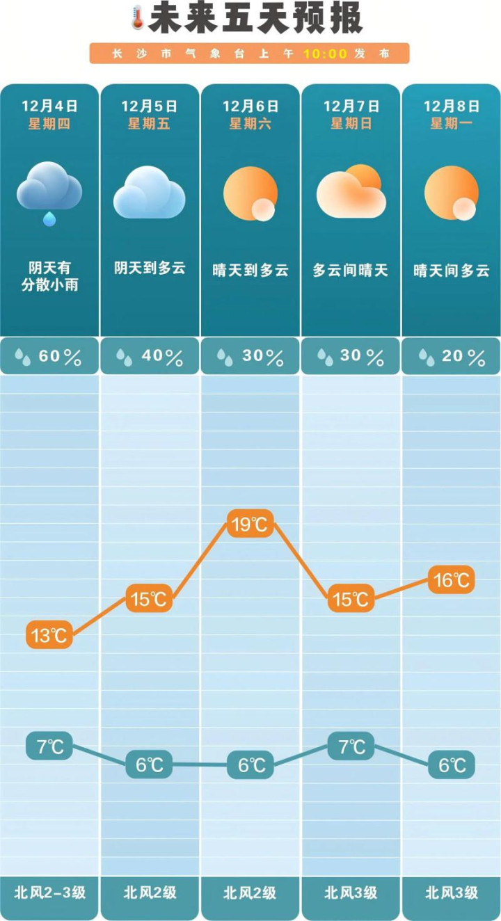 长沙晚报掌上长沙12月3日讯(全媒体记者舒元臻)在冷空气的影响下,今日湖南省内大部气温下滑,下午2时多地气温都在10℃至15℃之间,其中长沙15.2℃。与此同时,记者注意到,明天长沙可能还要洒点小雨。但别急着取消出行计划,本周末的好天气已经在路上了!根据长沙市气象台最新预报显示,气温从周五开始将逐步回升,并且阳光也同步回归,市民可根据天气变化合理安排生活出行。